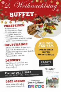 Auch 2024 bieten wir wieder am 2. Weihnachtstag den 26.12.2024 ein ganz tolles Brunch-Buffet von 11 bis 14 Uhr für Ihre Familie. In den vergangenen Jahren waren wir IMMER aus reserviert – von daher bitte in jedem Fall frühzeitig und verbindlich reservieren !